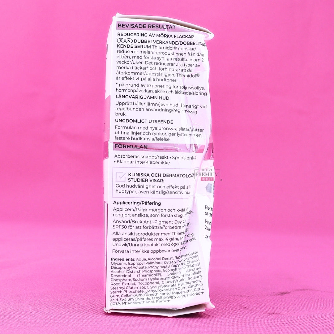 Eucerin Anti-Pigment Day Cream SPF30 es una crema facial diaria antimanchas con protección solar que reduce eficazmente las manchas oscuras y previene su reaparición. Gracias a su exclusiva fórmula con Thiamidol™ y filtros UVA/UVB SPF30, ayuda a unificar el tono, proteger contra el fotoenvejecimiento y devolver la luminosidad natural de la piel.