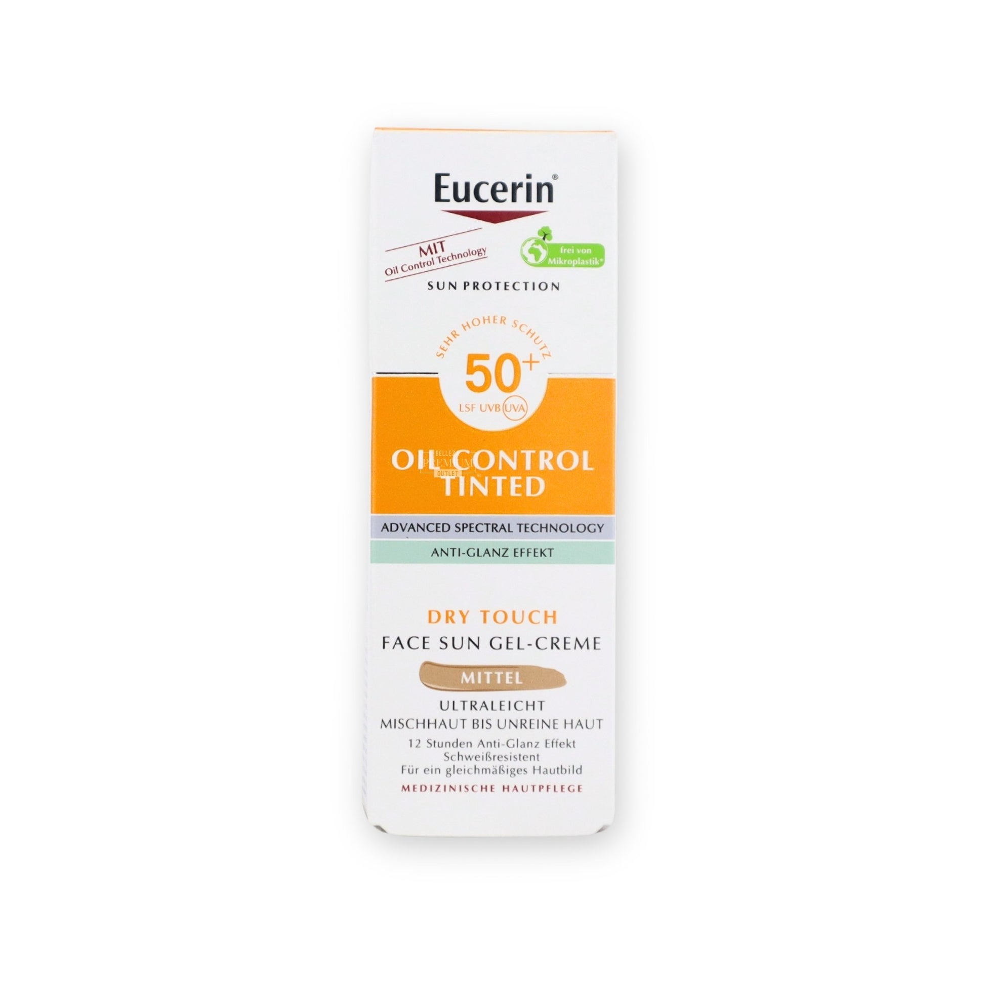 Eucerin Sun Oil Control SPF 50+ Tono Medio 50ml es un protector solar facial con color para piel mixta a grasa, que combina alta protección SPF 50+ con control de sebo. Su fórmula ofrece un ligero acabado mate, unifica el tono de la piel y previene el fotoenvejecimiento.