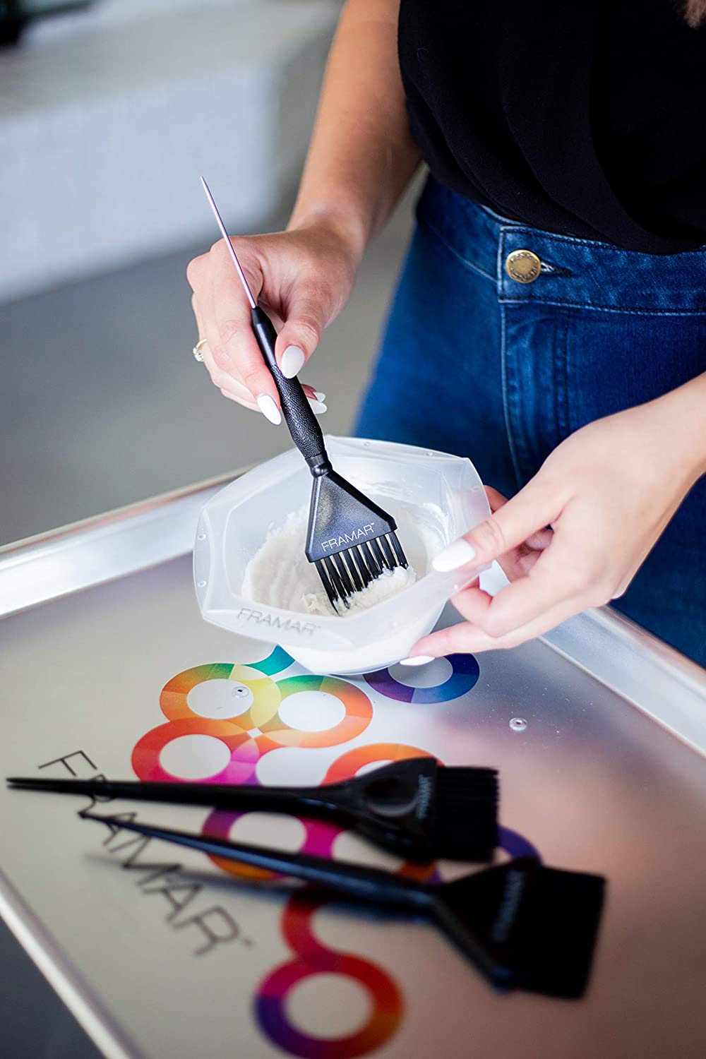 - Las famosas cerdas AccuSoft de Framar están afiladas para recoger y distribuir el color en el cabello de manera uniforme, rápida y precisa.