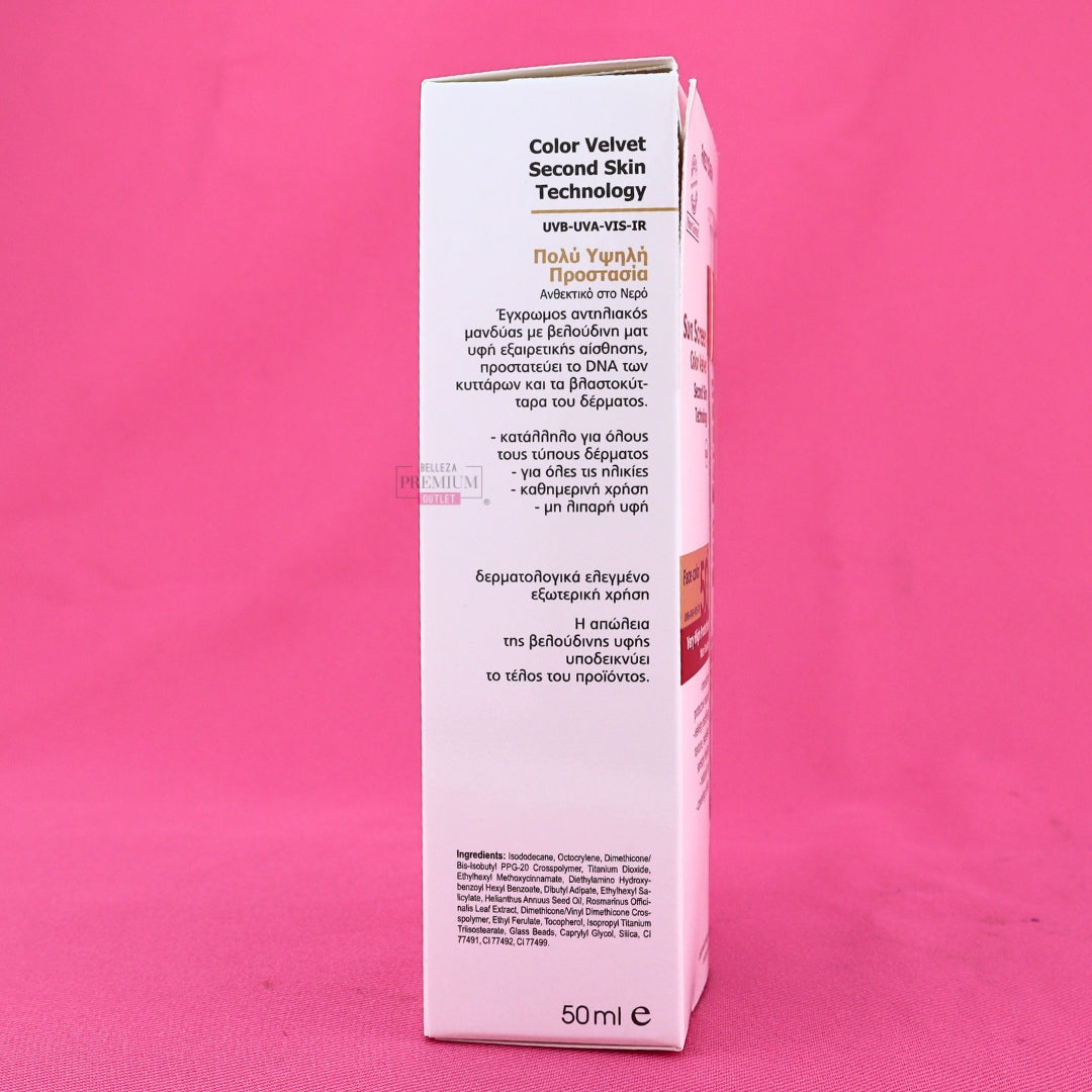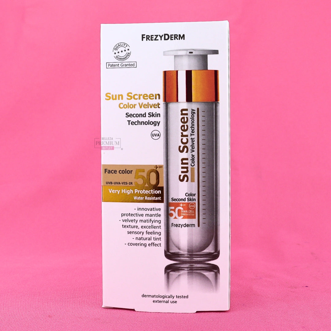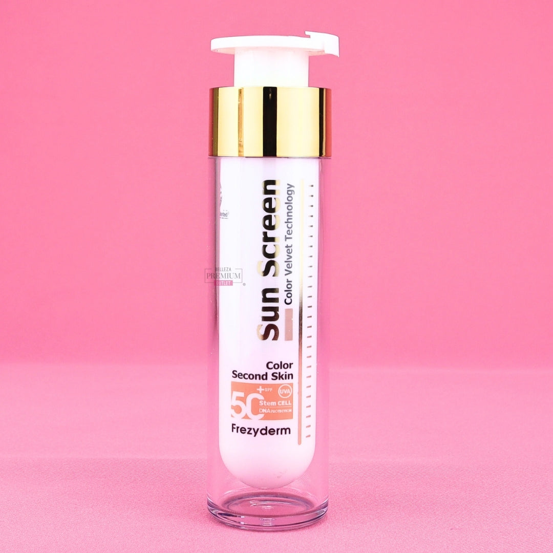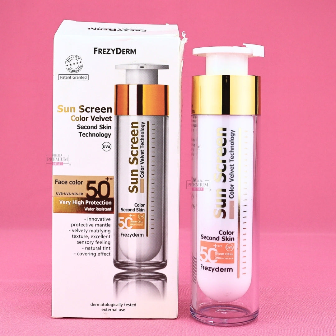 FREZYDERM Sun Screen Velvet Color Face SPF 50+ 50ml es un innovador fotoprotector facial con color, diseñado para proporcionar una altísima protección solar mientras ofrece un acabado uniforme y aterciopelado. Gracias a su tecnología Second Skin, este protector solar se adapta a la piel como una “segunda piel”, dejando un efecto invisible y mate, ideal para uso diario incluso bajo el maquillaje.