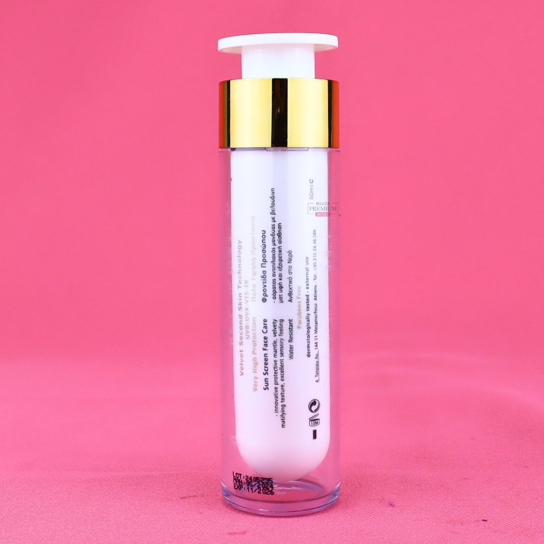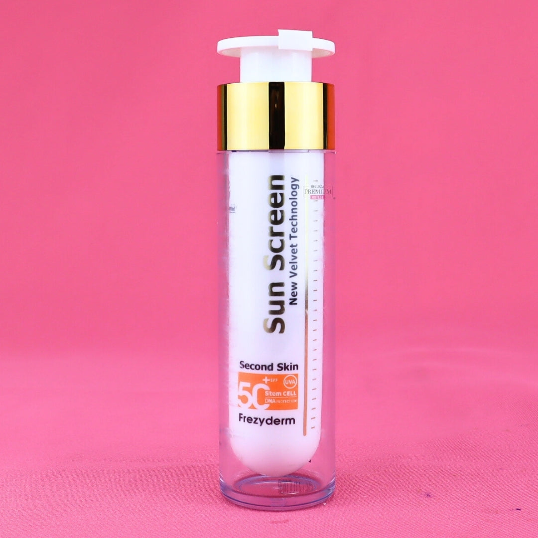 Frezyderm Sun Screen Velvet Face SPF 50+ es un protector solar facial de textura aterciopelada y acabado invisible. Ofrece protección solar muy alta con filtros de amplio espectro contra los rayos UVA/UVB, y al mismo tiempo proporciona un efecto matificante, alisador y difuminador de imperfecciones, ideal como base de maquillaje.