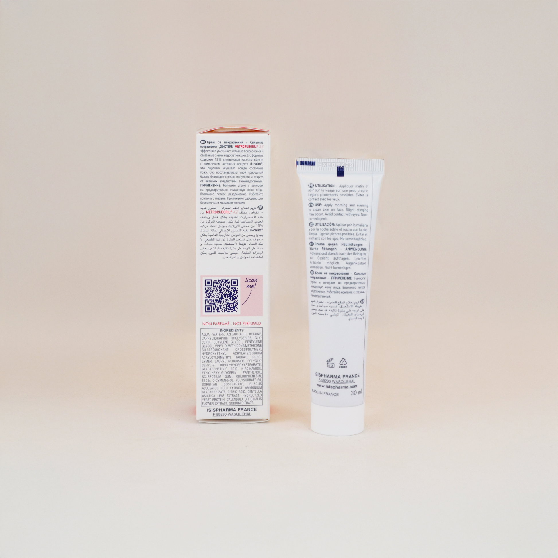 Isispharma Metroruboril A.Z es una crema dermatológica diseñada para reducir eficazmente el enrojecimiento severo y las imperfecciones asociadas, especialmente en pieles sensibles o con rosácea en fase papulopustulosa. Su fórmula combina un 15% de ácido azelaico con el complejo de activos ß-CALM, proporcionando alivio, hidratación y mejorando la microcirculación cutánea.
