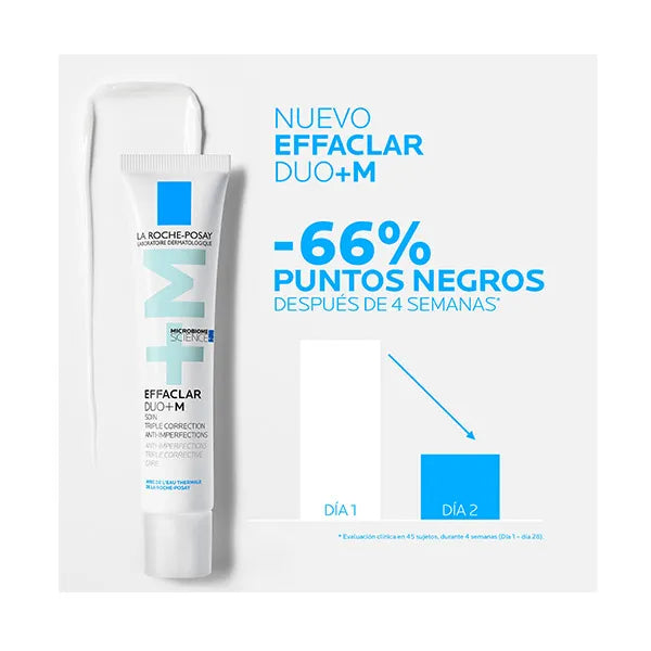 La Roche-Posay Effaclar Duo(+) M 40ml es un tratamiento corrector anti-imperfecciones con efecto matificante, formulado específicamente para piel grasa con tendencia acneica, que ayuda a reducir granos, puntos negros y marcas, controlar el exceso de sebo y mejorar la textura de la piel.