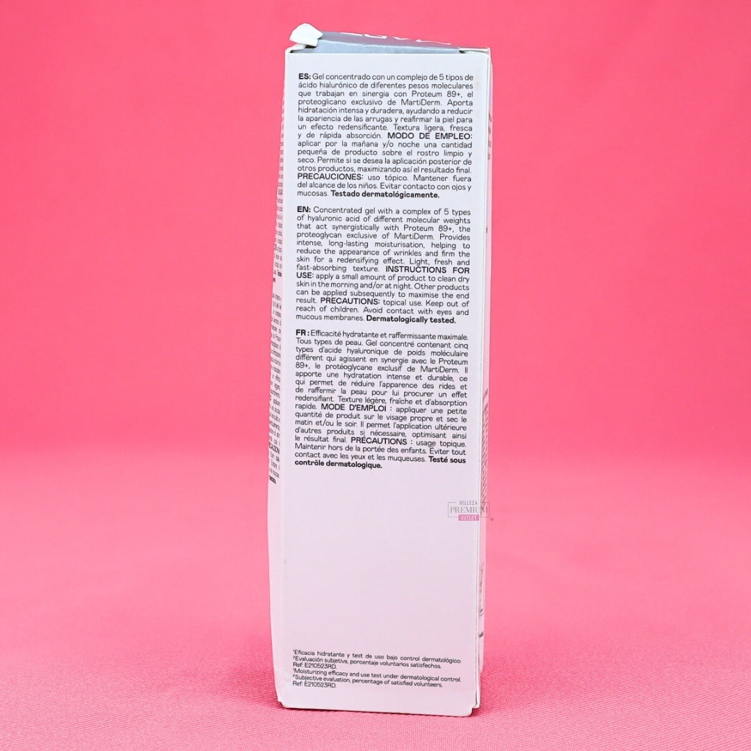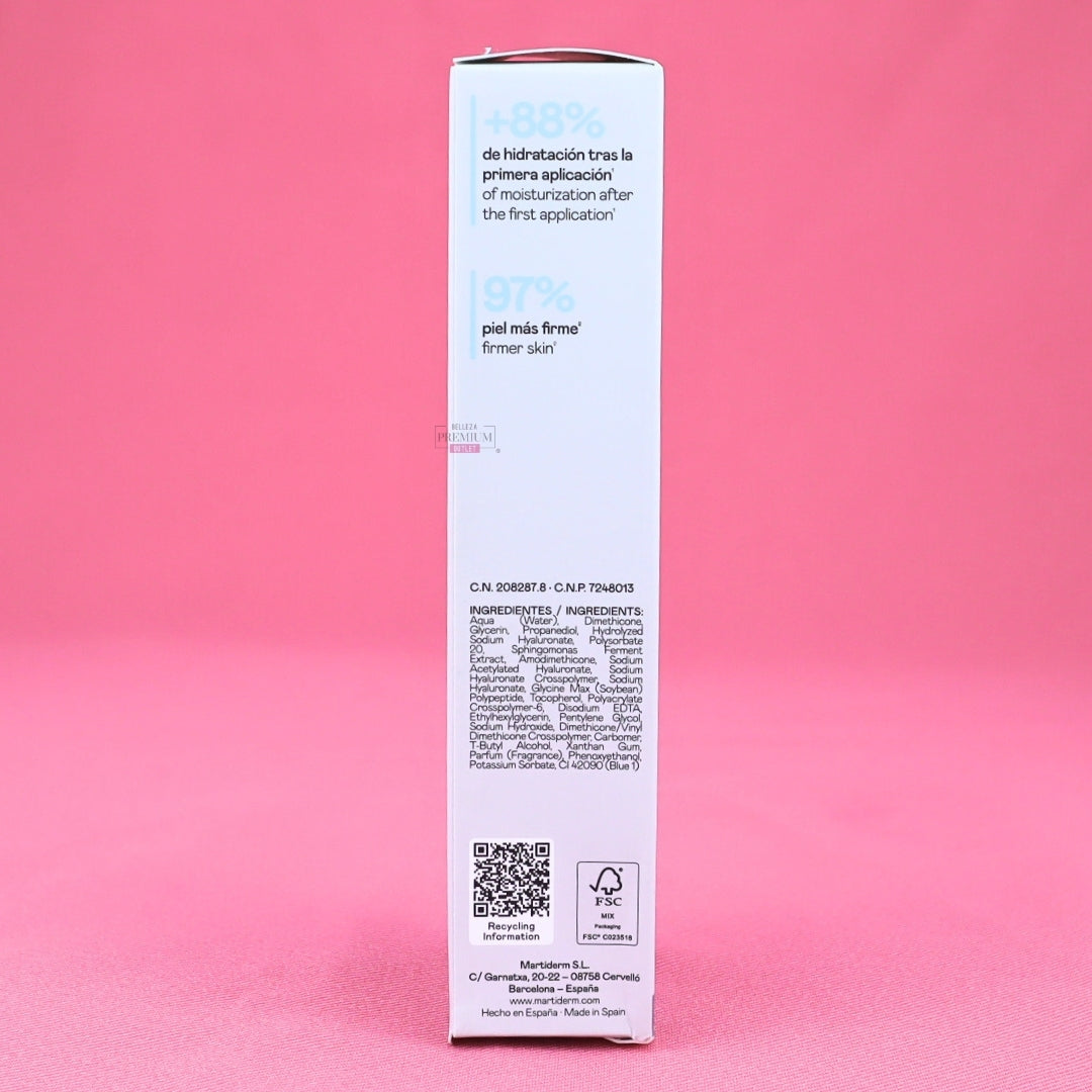 Con una textura ultraligera, efecto refrescante inmediato y acabado sedoso, este sérum actúa como un potente booster hidratante y reafirmante, ideal para todo tipo de pieles, incluidas las más sensibles. Su fórmula combina ácido hialurónico de diferentes pesos moleculares con Proteum 89+, un exclusivo proteoglicano de Martiderm que mejora la estructura dérmica y potencia la síntesis de colágeno y elastina.