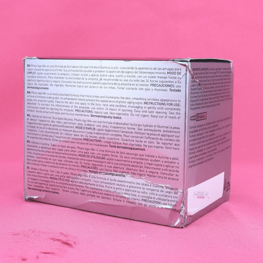 Martiderm Photo Age HA+ es un tratamiento intensivo en ampollas diseñado para combatir el fotoenvejecimiento. Su fórmula combina ingredientes hidratantes, antioxidantes y reparadores que ayudan a reducir arrugas, mejorar la firmeza, unificar el tono y proteger la piel de los daños ambientales.