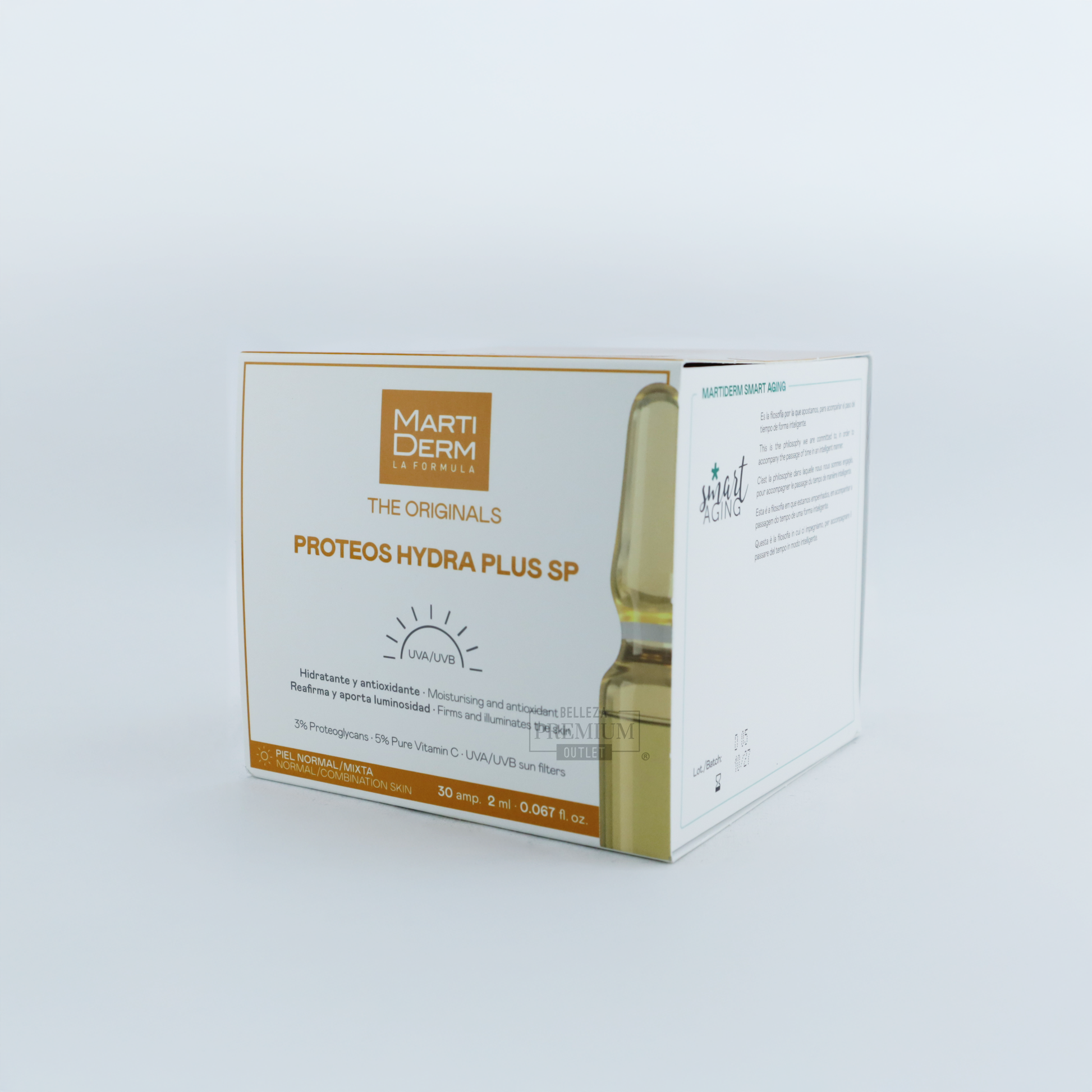 MartiDerm LOS ORIGINALES PROTEOS HYDRA PLUS SP 30 Ampolletas es un tratamiento facial en formato ampolla con acción hidratante, reafirmante y antioxidante. Su fórmula con vitamina C pura y proteoglicanos ayuda a mantener la piel luminosa, firme y protegida frente al daño solar y ambiental.