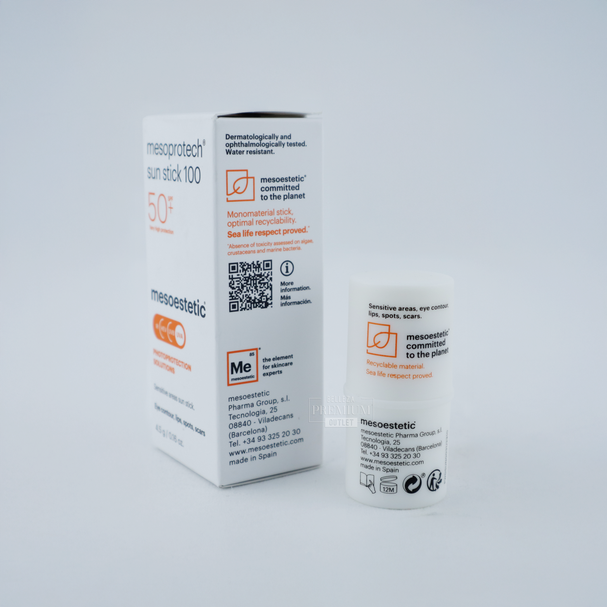 Mesoestetic Mesoprotech Sun Protective Repairing Stick 100 es un protector solar en formato stick de alta protección SPF 100, diseñado para zonas sensibles o expuestas como labios, cicatrices, zonas delgadas o tatuajes. Su fórmula concentrada protege frente a los rayos UVA y UVB, evitando quemaduras, daños solares y fotoenvejecimiento.