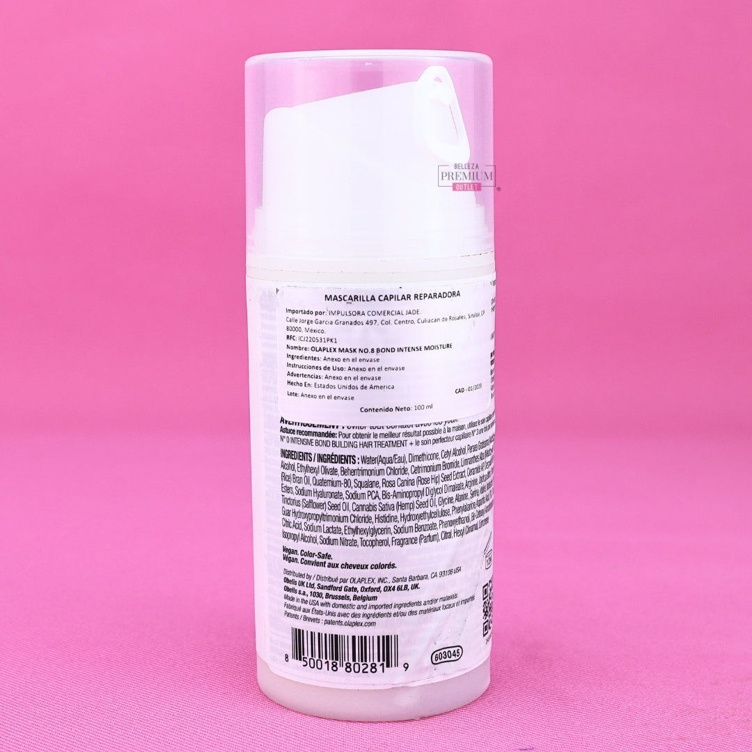 Olaplex No.8 Bond Intense Moisture Mask es una mascarilla capilar de tratamiento profundo que forma parte de la línea Olaplex, conocida por su tecnología de reparación del cabello. Diseñada para restaurar y revitalizar el cabello dañado, esta mascarilla ofrece hidratación intensa y fortalecimiento.