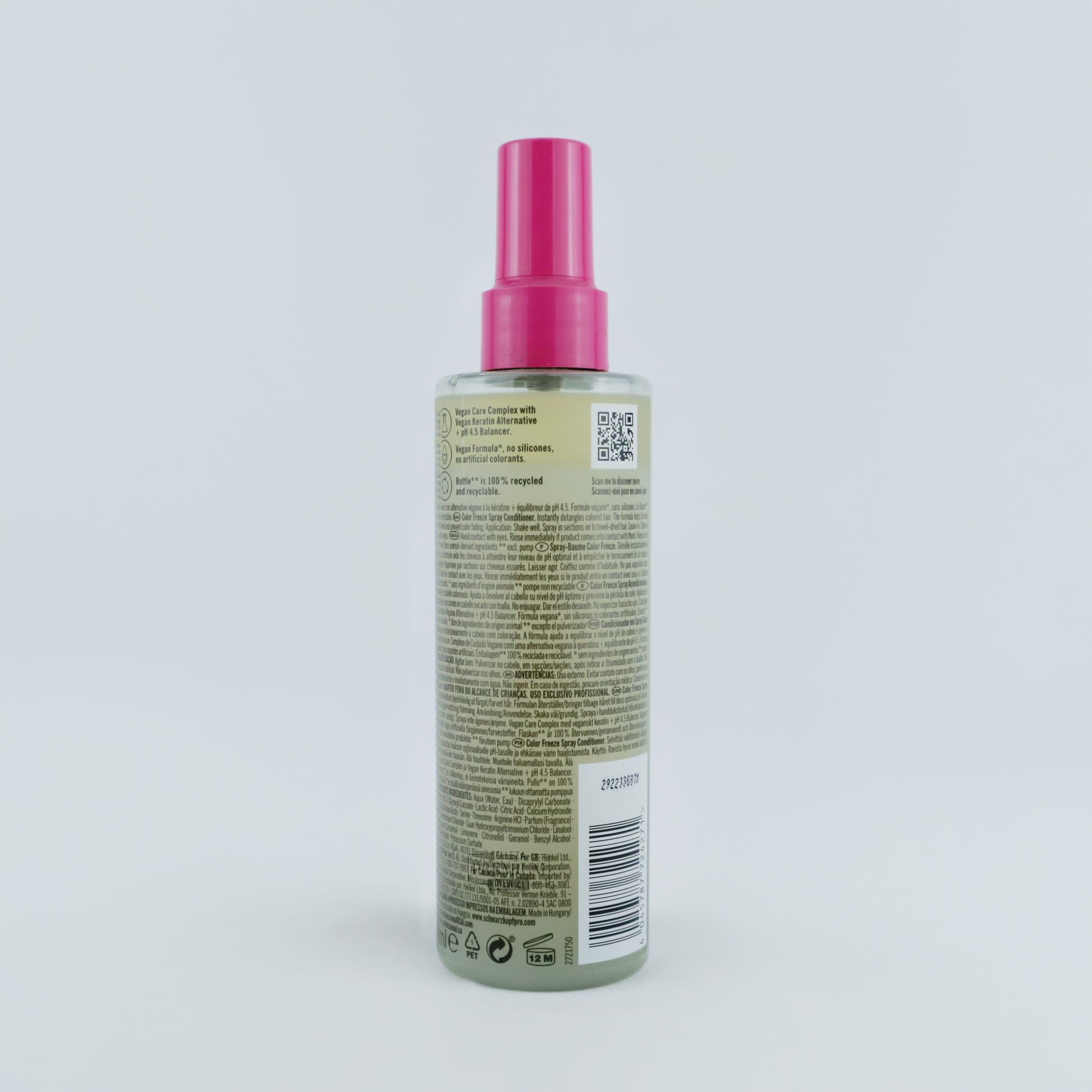 Es un acondicionador bifásico en spray sin enjuague, ideal para cabello teñido, que equilibra el pH del cabello hasta 4.5 y ayuda a conservar el color vibrante y brillante por más tiempo, mientras desenreda y suaviza al instante.