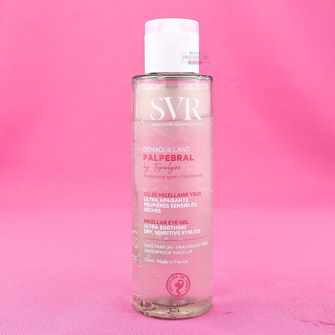 SVR Palpebral Desmaquillante by Topialyse 125ml es un gel micelar de limpieza ultra suave diseñado específicamente para desmaquillar el área del contorno de ojos, incluso los párpados más sensibles, secos o con tendencia a la irritación. Gracias a su textura en gel y fórmula minimalista, permite una limpieza eficaz sin frotar, aportando confort inmediato y ayudando a preservar la barrera cutánea. Es apto para ojos sensibles, usuarios de lentes de contacto y personas con intolerancias cutáneas.