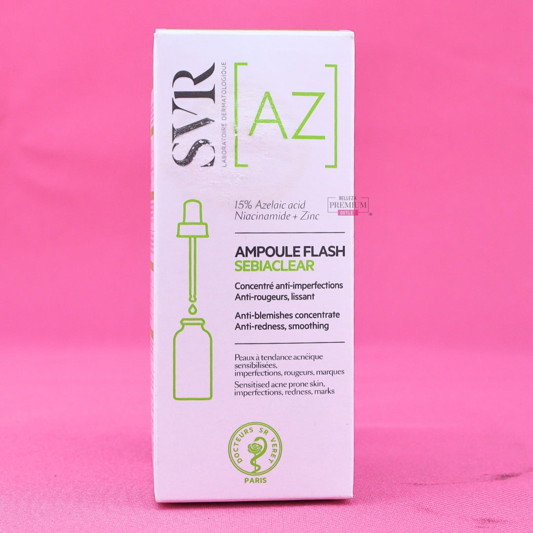 SVR Sebiaclear Ampoule Flash (AZ) es un tratamiento facial intensivo corrector y embellecedor instantáneo para pieles mixtas a grasas con imperfecciones, brillo o textura irregular. Su fórmula combina niacinamida, vitamina C y péptidos reafirmantes para alisar, matificar y revitalizar la piel en minutos, brindando un acabado luminoso y uniforme, ideal como base de maquillaje o “booster” diario.