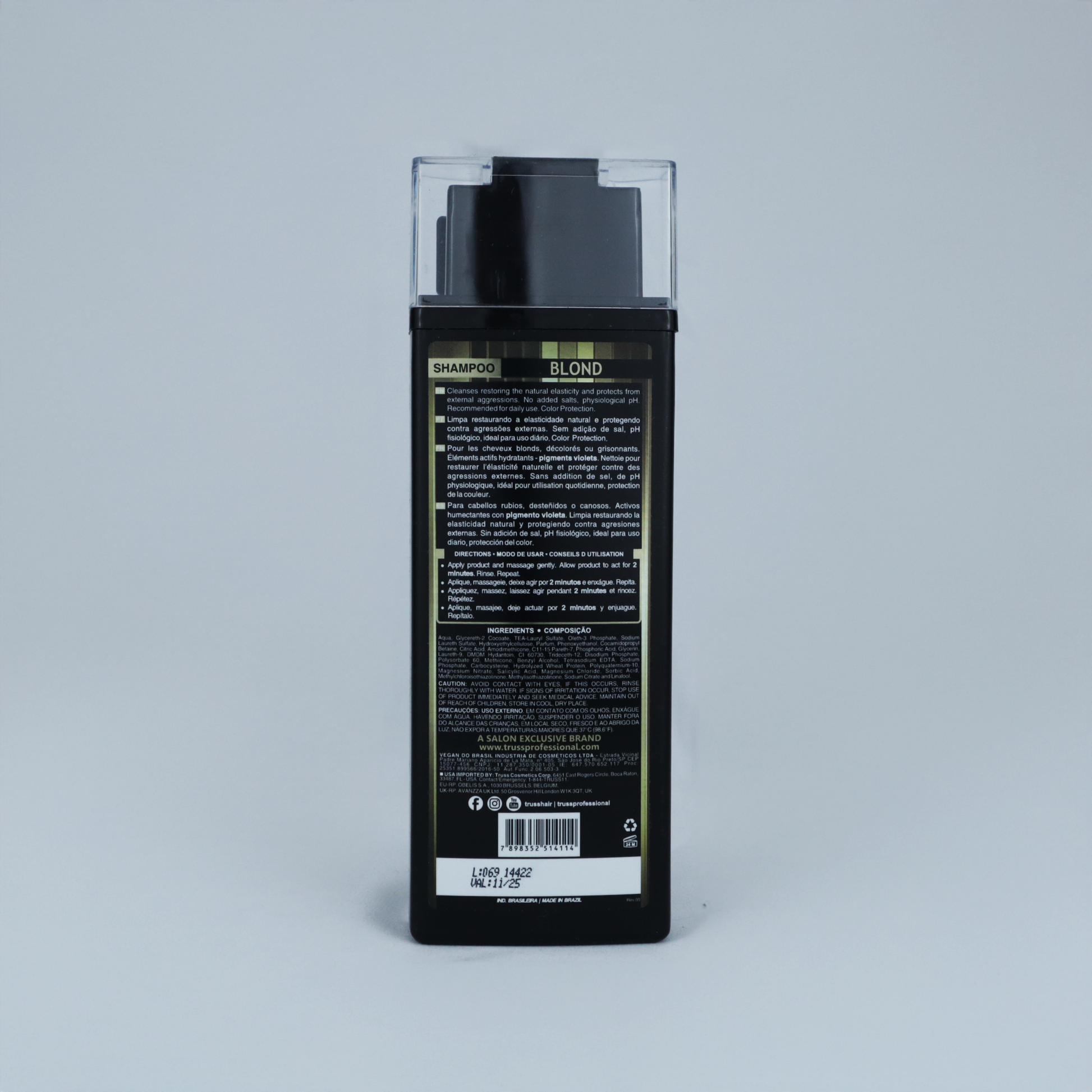 El TRUSS Blond Shampoo es un champú profesional formulado especialmente para cabellos rubios, decolorados o grises. Su fórmula avanzada con pigmentos violetas ayuda a neutralizar los tonos amarillentos y anaranjados no deseados, proporcionando un tono más frío y brillante al cabello. Además, hidrata profundamente, restaura la elasticidad natural y protege la fibra capilar.