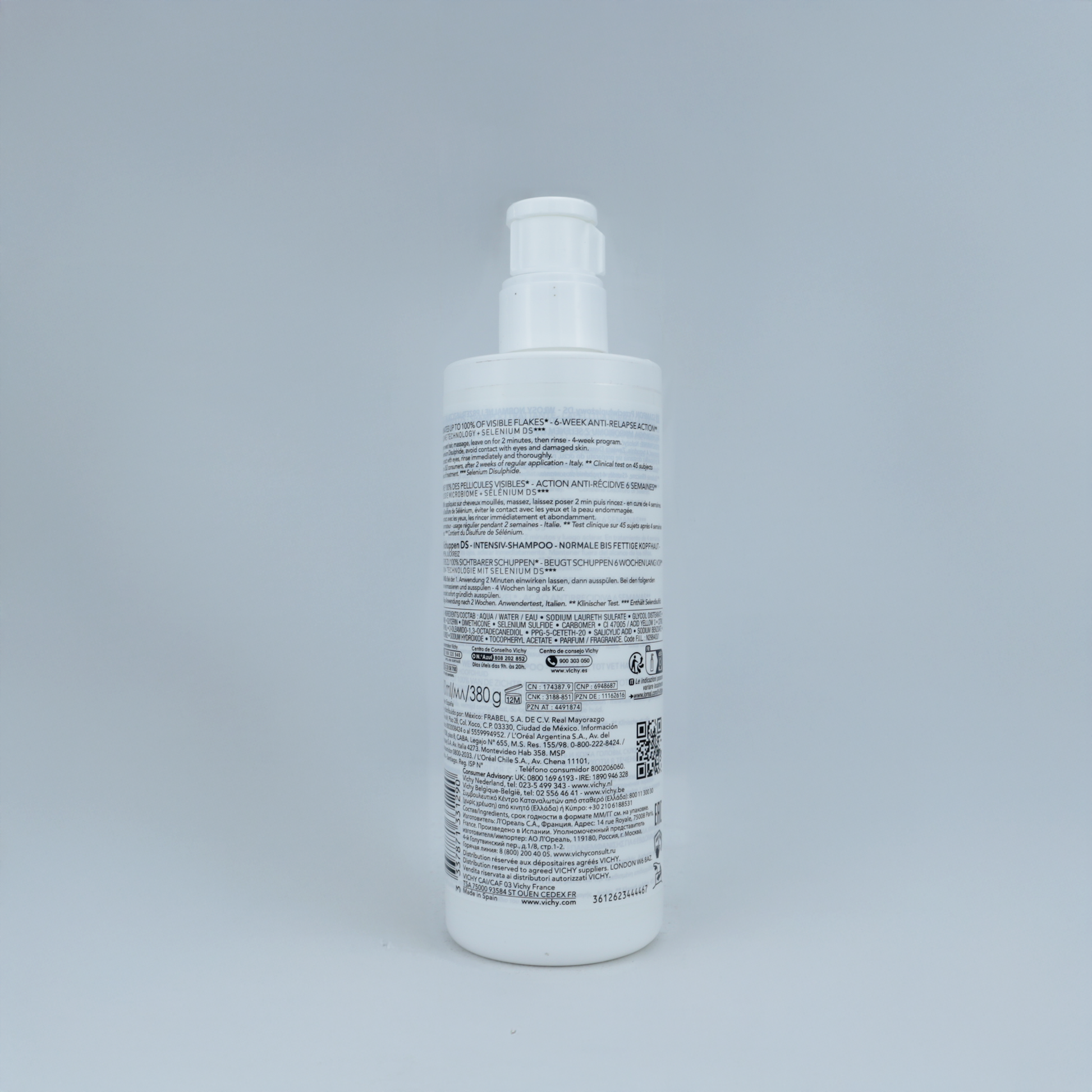 Aqua/Water, Selenium Sulfide, Glycerin, Salicylic Acid, Sodium Cocoamphoacetate, Vichy Mineralizing Thermal Water, entre otros.