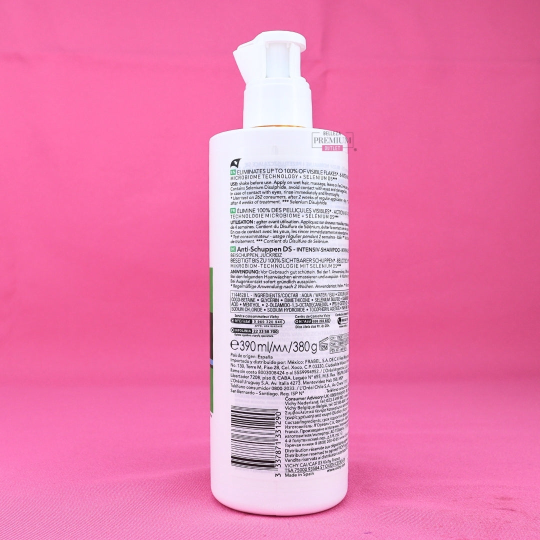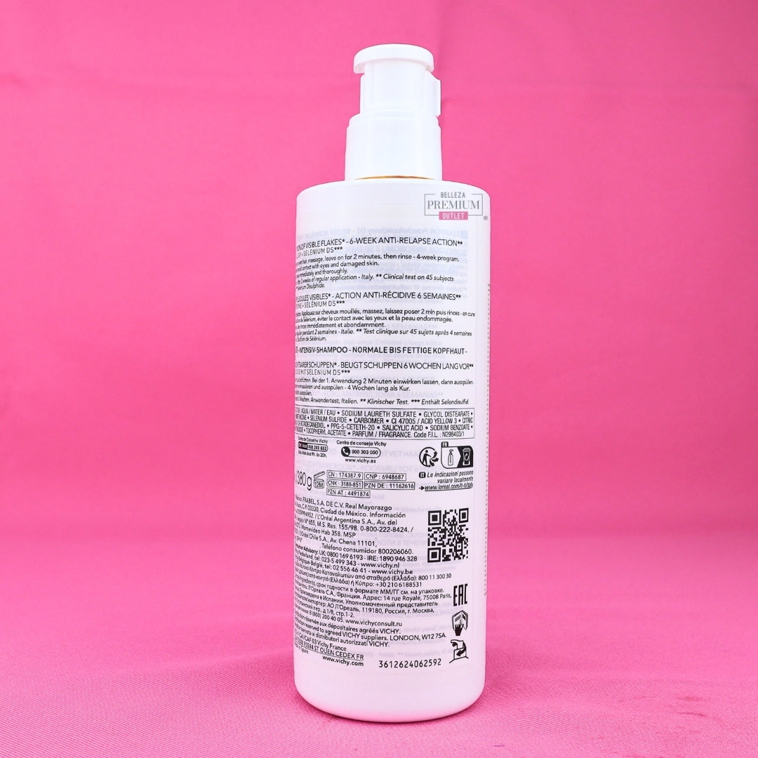 Aqua (agua), Sodium Laureth Sulfate, Cocamidopropyl Betaine, Glycerin, Sodium Chloride, Seleno Disulfide, Sodium Hydroxide, Citric Acid, Parfum (fragancia), Polyquaternium-10, Sodium Benzoate, Potassium Sorbate, Salicylic Acid, Vichy Thermal Water.