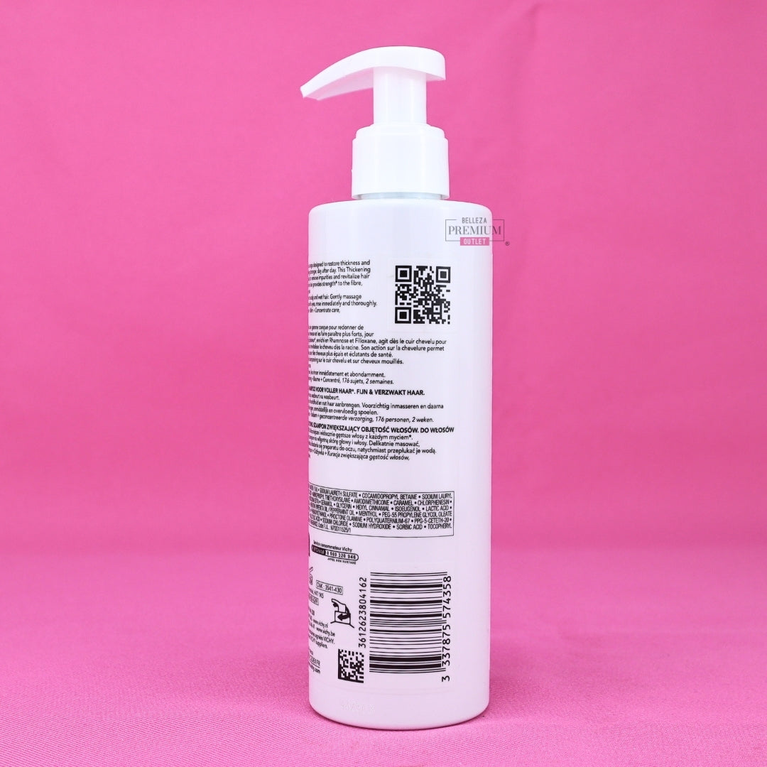 Aqua (Water), Sodium Laureth Sulfate, Coco-Betaine, Glycol Distearate, Stemoxydine, Filloxane, Panthenol, Parfum (Fragrance), Citric Acid, Sodium Benzoate, entre otros ingredientes seleccionados para fortalecer, densificar y revitalizar el cabello sin agredir el cuero cabelludo.