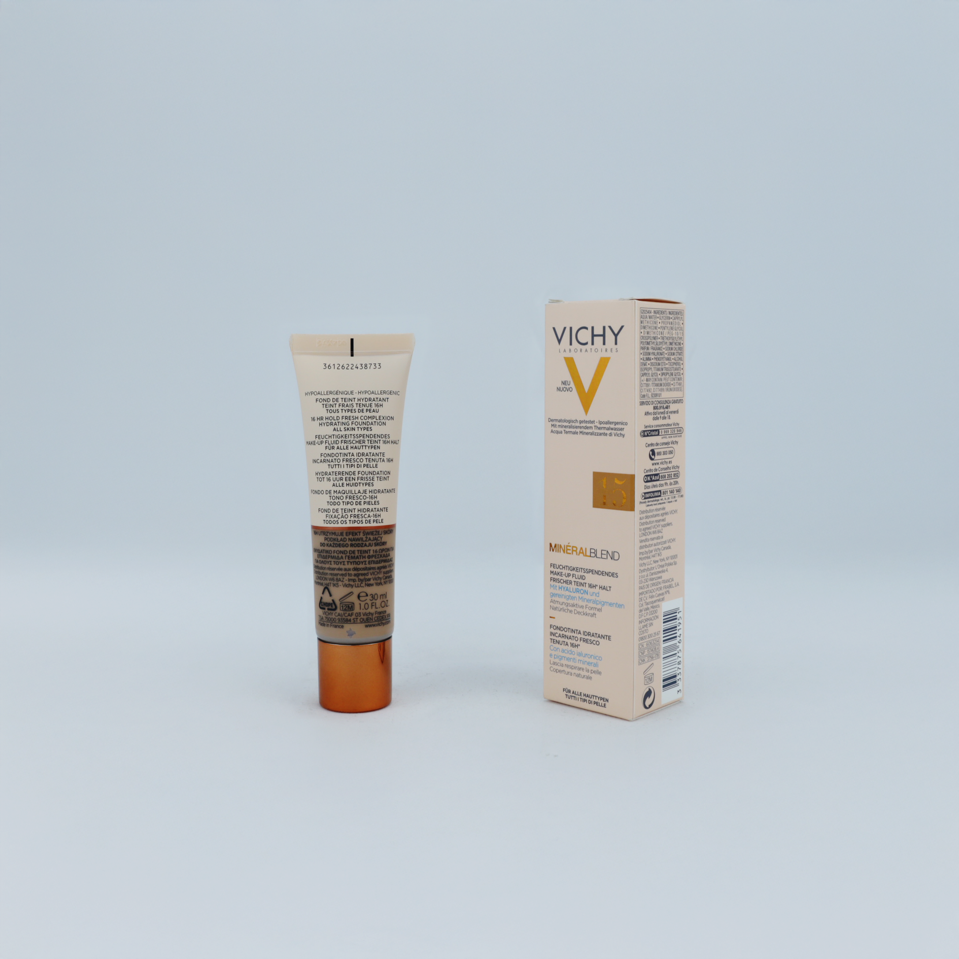 Vichy Mineralblend Foundation 15 – Terra es una base de maquillaje fluida e hidratante, ideal para pieles muy oscuras que buscan un acabado natural, uniforme y radiante. Su fórmula combina ácido hialurónico, pigmentos minerales y agua volcánica de Vichy para aportar una cobertura ligera a media, hidratación por 24 horas y una piel visiblemente más saludable y fresca día tras día.